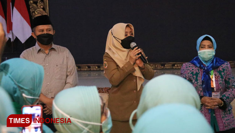 Bupati Mojokerto, Ikfina Fahmawati saat menyampaikan sambutan kepulangan para ibadah haji Kabupaten Mojokerto Kloter 33, Senin (8/8/2022) (Dok. Kominfokab Mojokerto for TIMES Indonesia)
