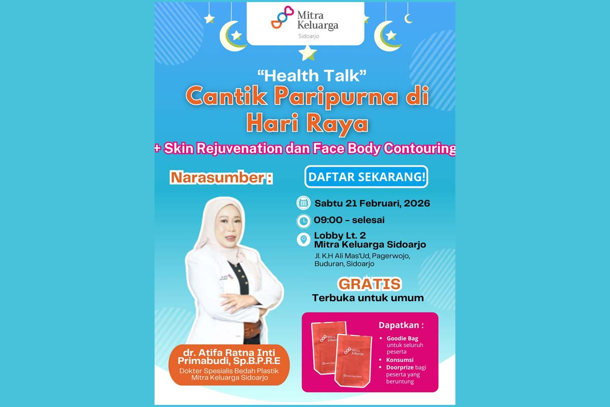 Kegiatan tersebut akan dilaksanakan pada Sabtu (21/2/2026) mulai pukul 09.00 WIB hingga selesai di Lobby Lantai 2 Mitra Keluarga Sidoarjo. Acara ini menghadirkan pemateri utama dr. Atifa Ratna Inti Primabudi, Sp.B.P.R.E, dokter spesialis bedah plastik yang berpraktik di rumah sakit tersebut.