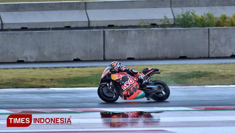 TIMES Jatim/Pembalap tim Red Bull KTM, Miguel Oliveira melahap trek basah Sirkuit Mandalika, saat lomba seri kedua MotoGP di Mandalika, Lombok, NTB, Minggu (20/3/2022). (FOTO: Tria Adha/TIMES Indonesia)