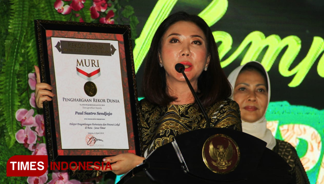 Gubernur Jatim, Kofifah Indar parawansa dalam acara pemecahan rekor muri Kampung Hijau, Tempenosaurus dan Jatimpark Grup. Sabtu,6/4/2019.